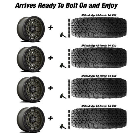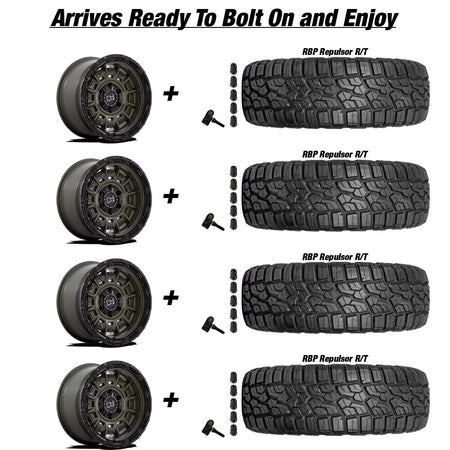 • (4)Mounted and balanced Tires. Your Choice of BFGoodrich All Terrain T/A K02 or RBP Repulsor R/T 37x12.5R17