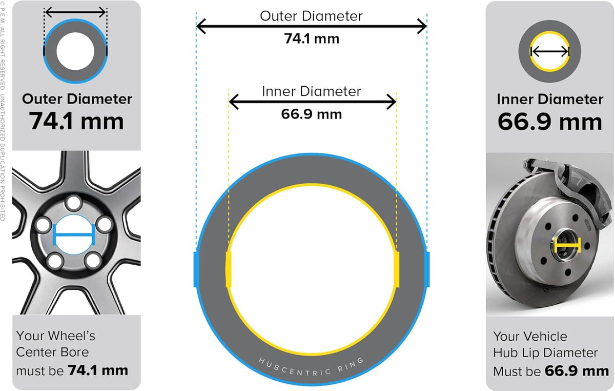 - IMPORTANT: Do not only go off of vehicle make. Before ordering, measure your rim/wheel center bore and your vehicle hub lip size, and make sure it matches the hub centric rings specifications shown on this listing. Installation is simple and requires common tools used to remove/install rims and tires. NOTE that these can only eliminate vibrations caused by uncentered wheels. Vibrations may also be caused by improperly balanced or damaged wheels and tires, worn out joints, among others.