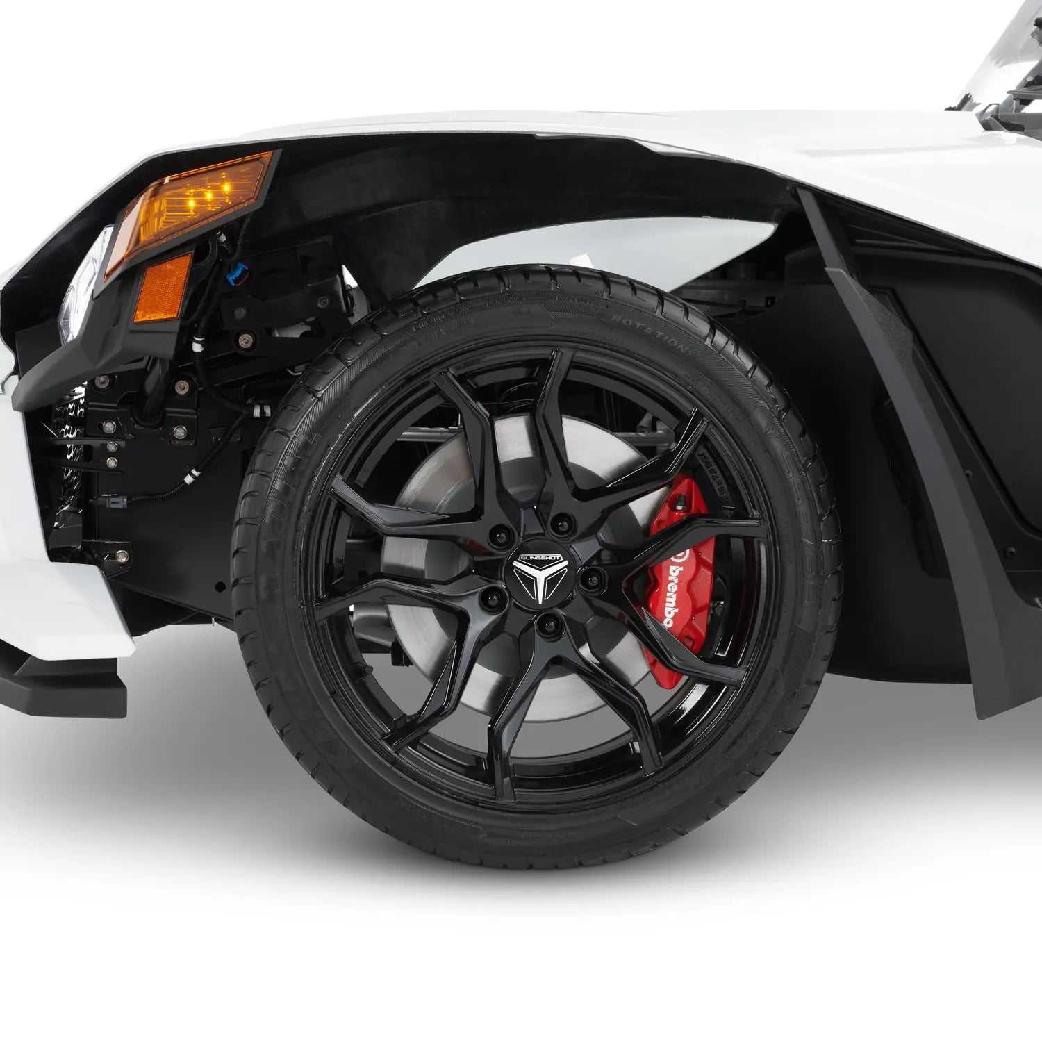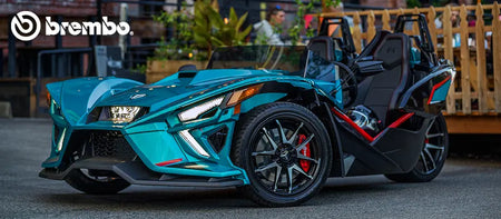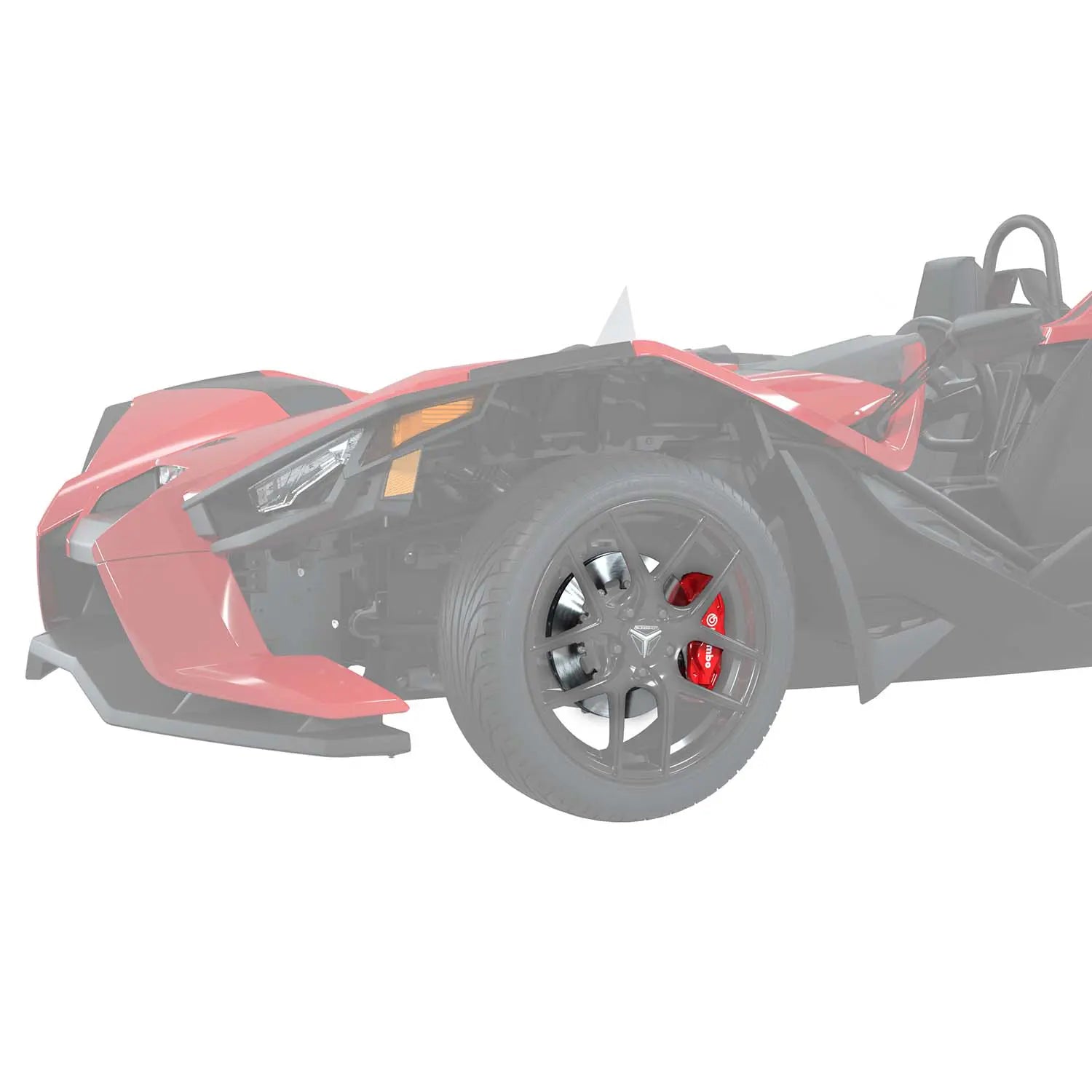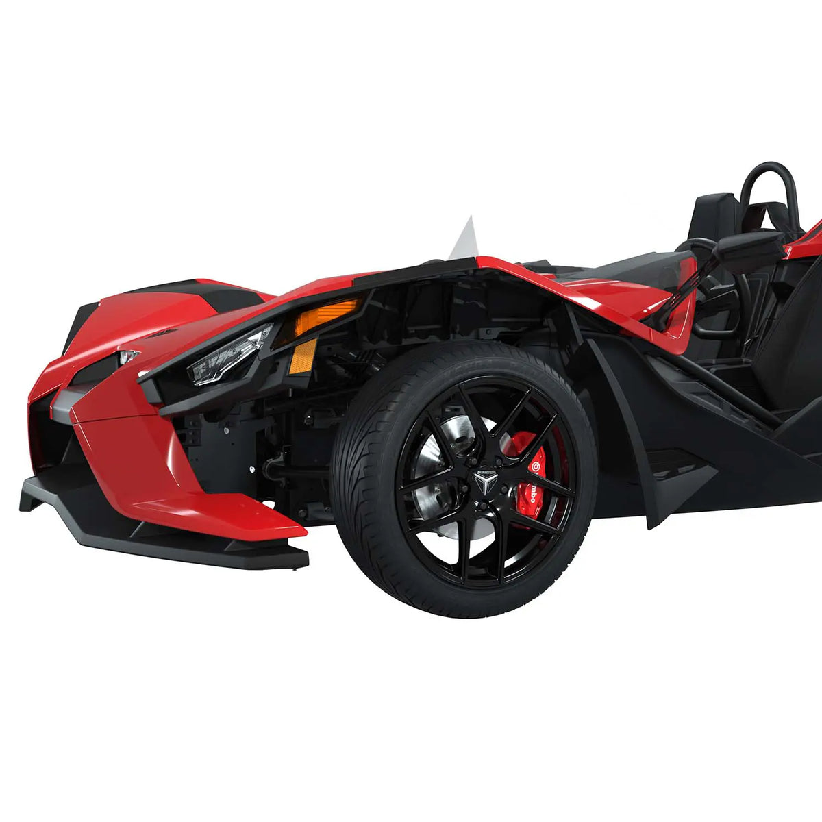 The premium BREMBO braking system with 4-piston painted calipers, and 339MM vented rotors improve the braking feel, aesthetics, and comfort of your Slingshot. This braking system offers increased sensitivity to the driver and pedal.